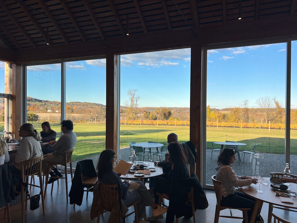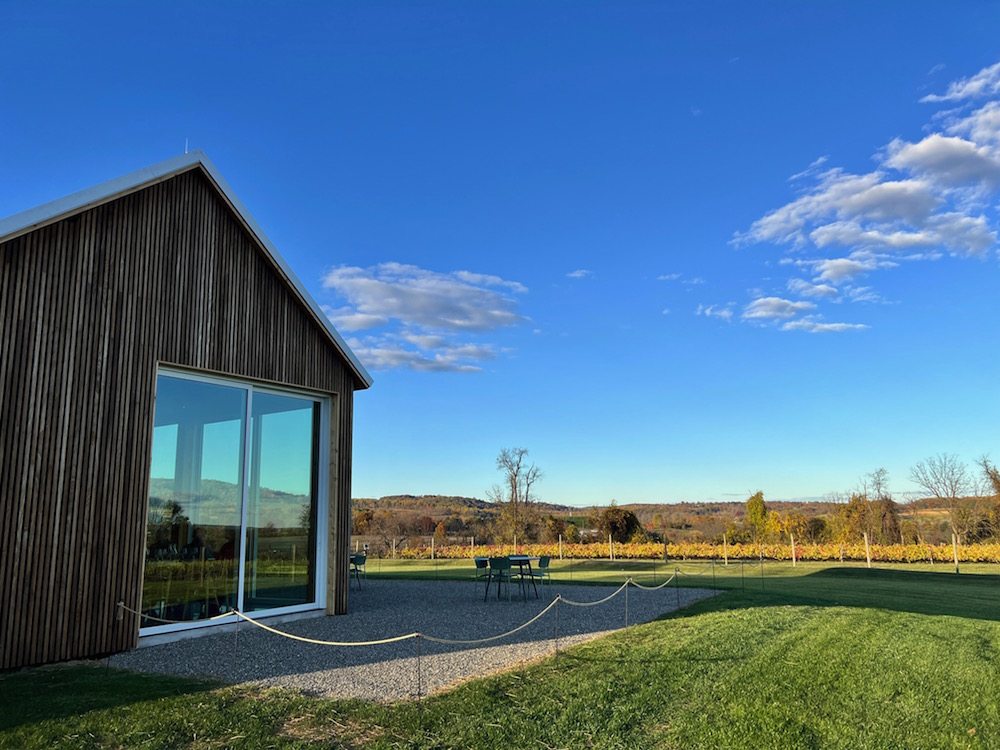 Many of the 15-or-so acres of vines planted on protected farmland can be seen from the tasting room’s floor-to-ceiling windows. Past those vines, there are views for 5 to 7 miles of the region’s rolling hills, green and lush in the summer and full of vibrant color in the fall. When the weather cooperates, visitors can appreciate those views from inside the tasting room or from a seat on the patio with its Adirondack chairs and fire pits.